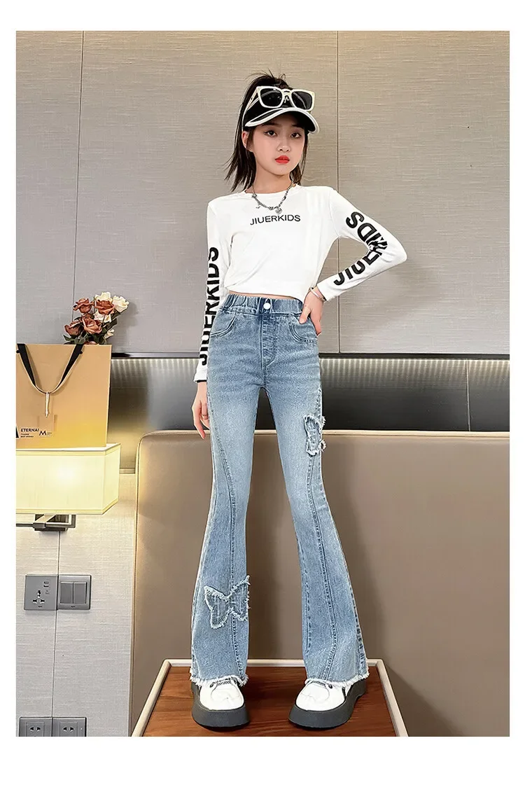 2024 Hot-selling girls’ spring and autumn flared jeans, modified leg-shaped jeans with high waistline for casual girls.