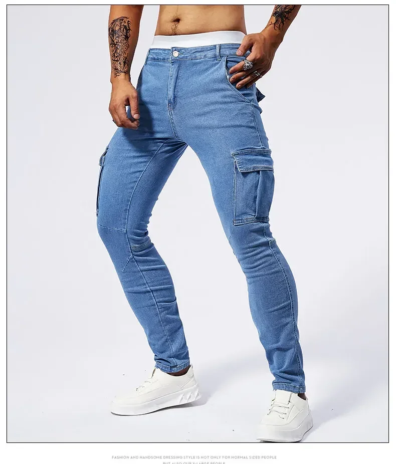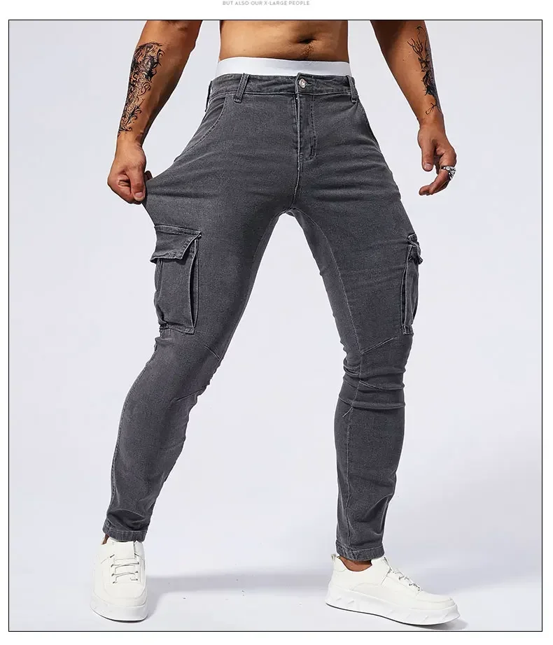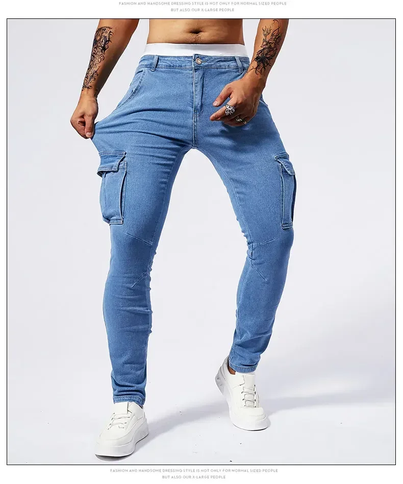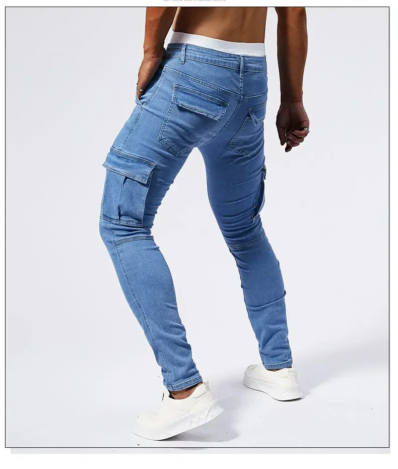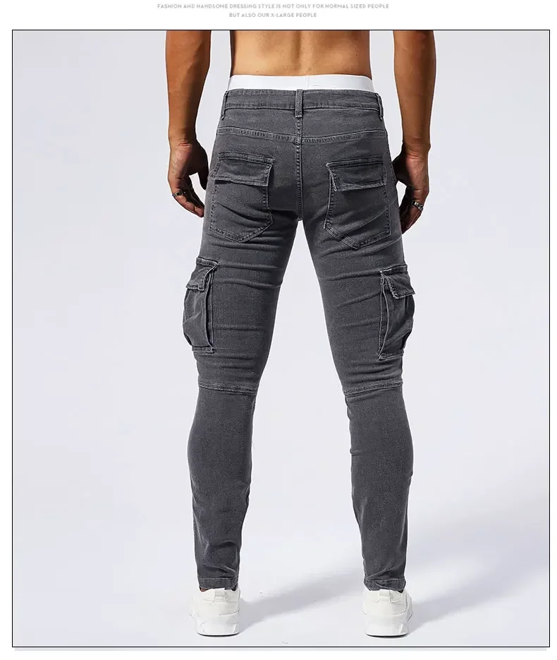 2025 New Men Street Elastic Denim Jeans Multi Pockets Cargo Pants Casual Slim Denim Trousers Fashion Y2k Joggers Baggy Man Pants