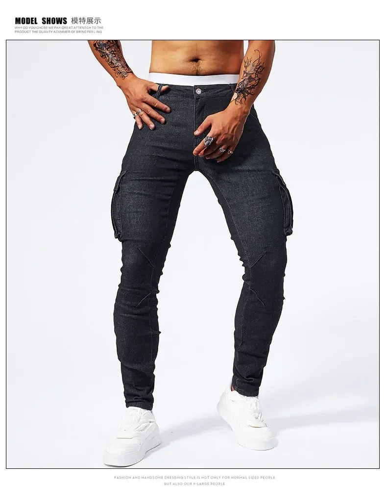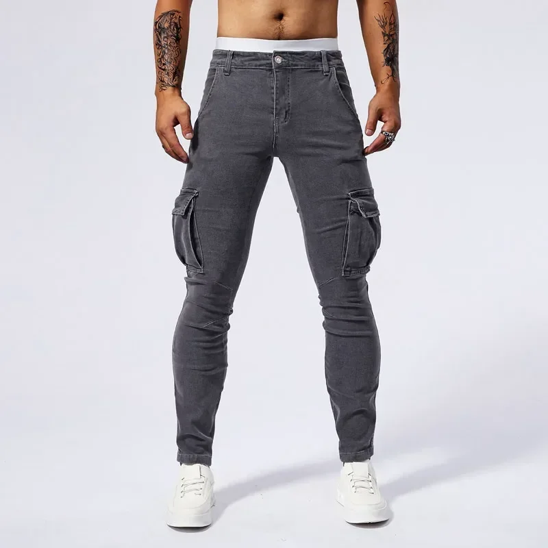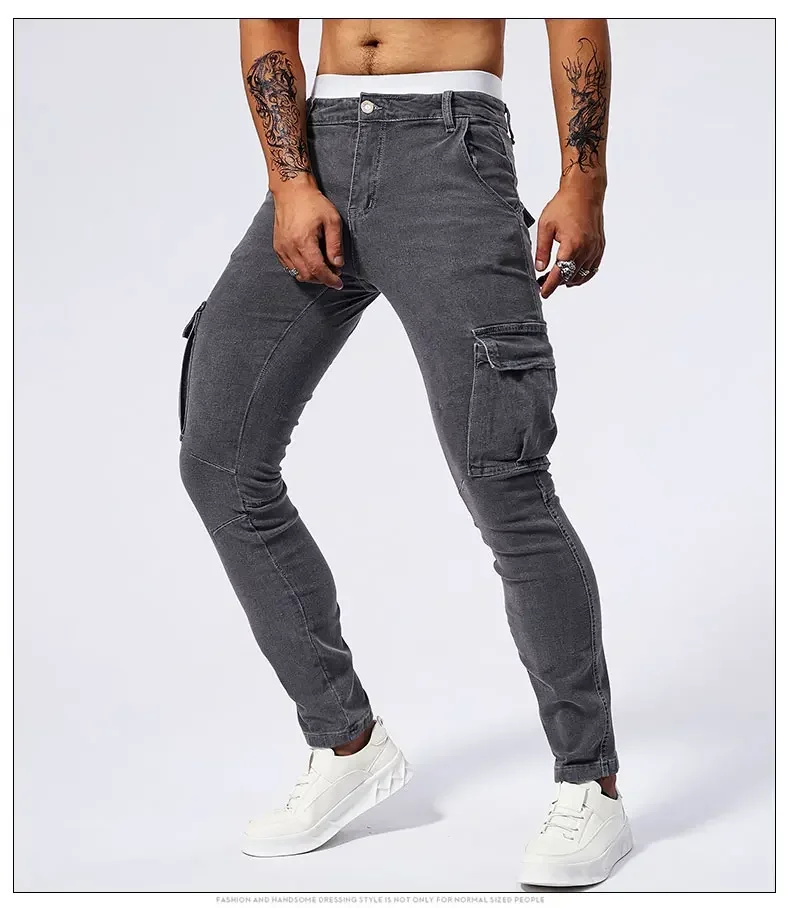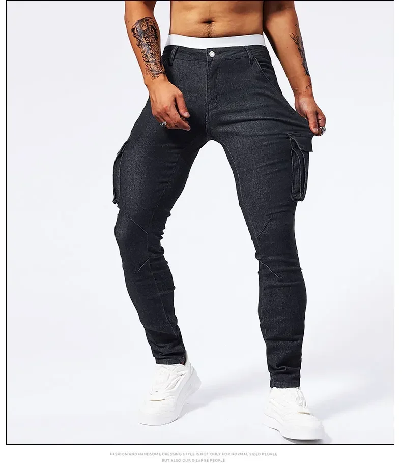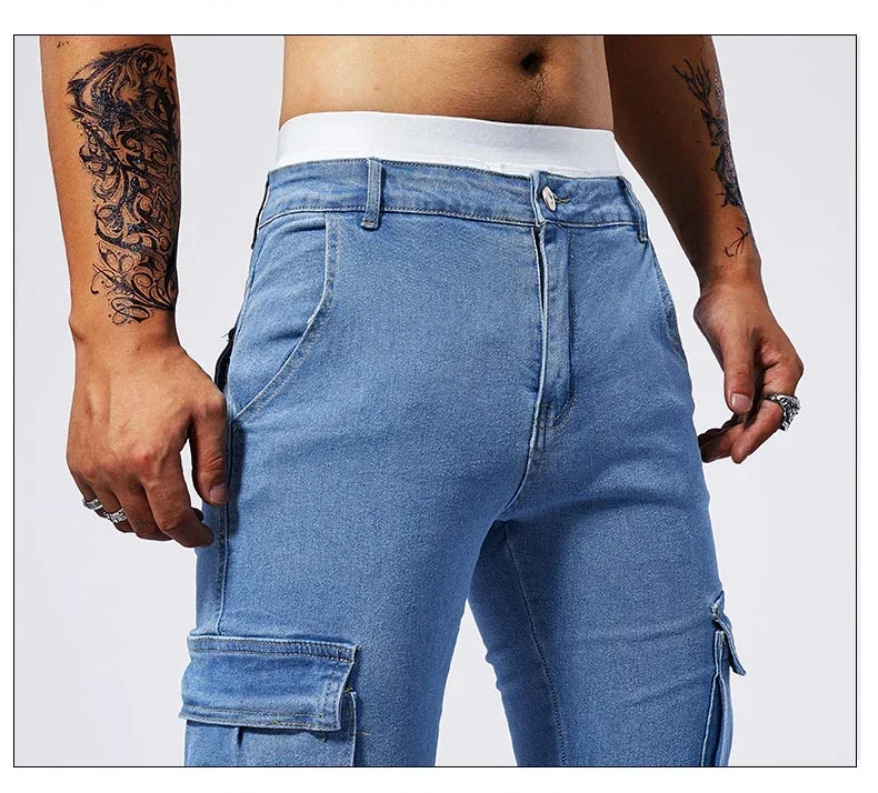 2025 New Men Street Elastic Denim Jeans Multi Pockets Cargo Pants Casual Slim Denim Trousers Fashion Y2k Joggers Baggy Man Pants