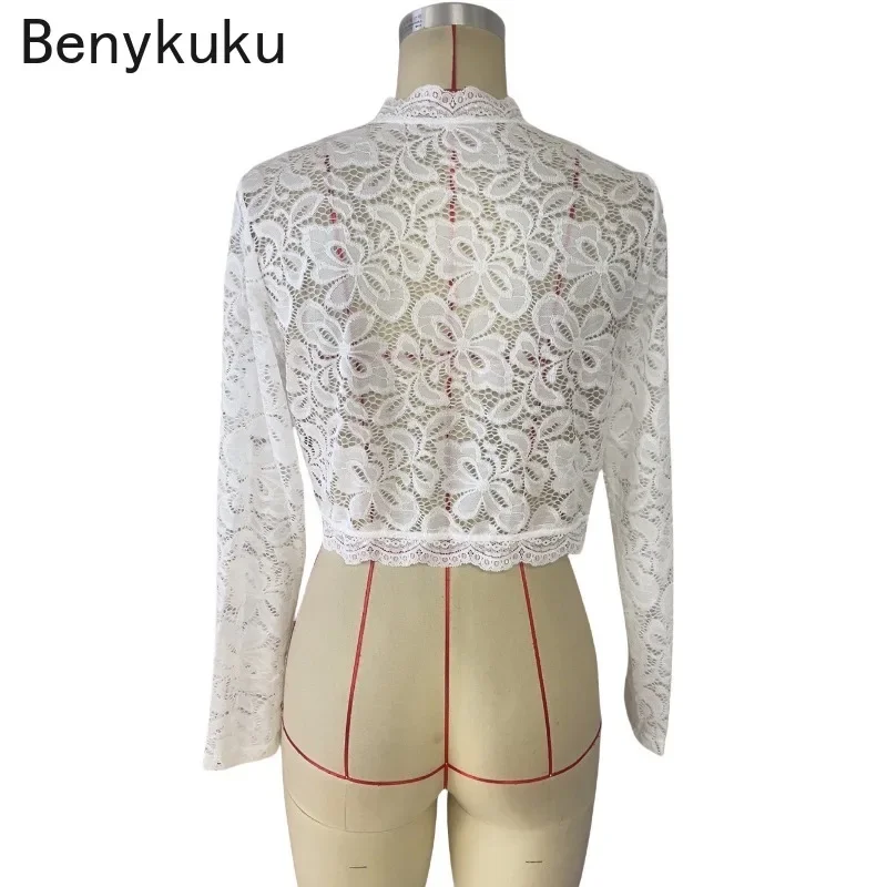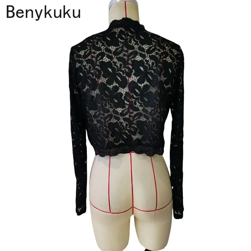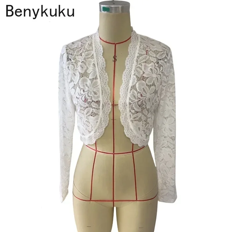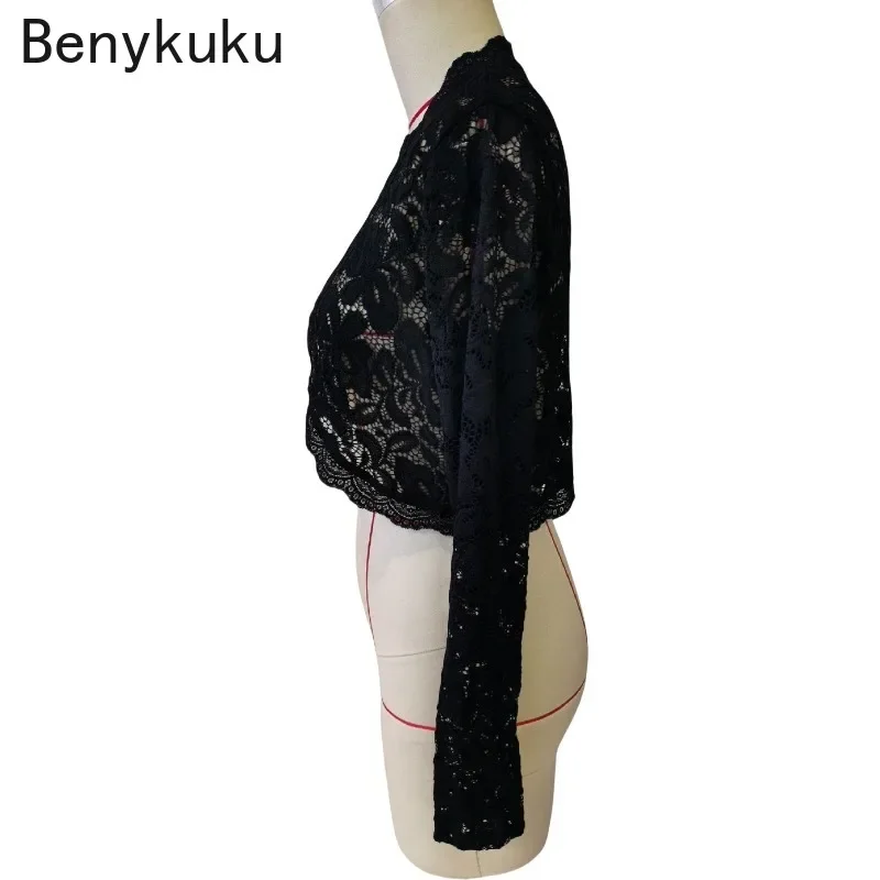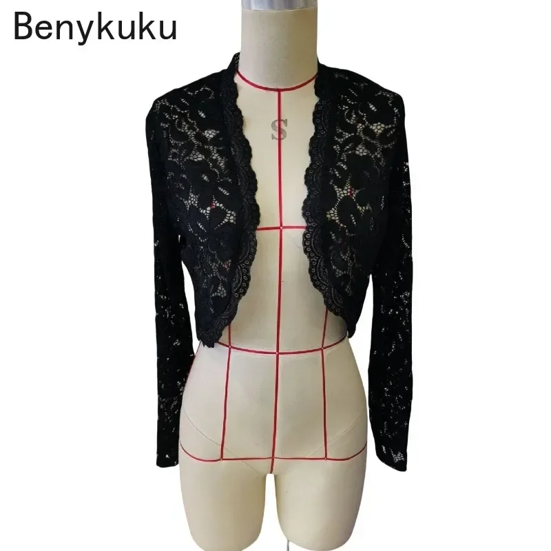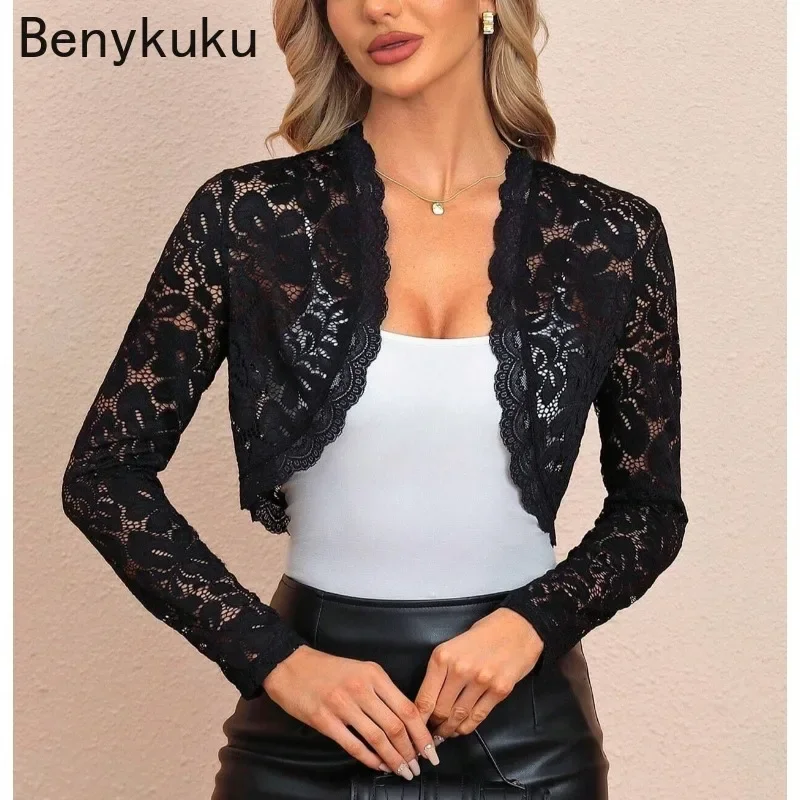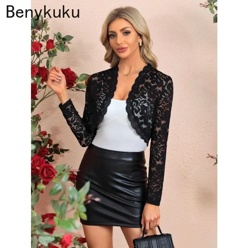 Black Floral Lace Cropped Tops Women Scalloped Long Sleeve Cardigan Coat Open Stitch 2025 Summer Cover Up Jacket Shrug Bolero