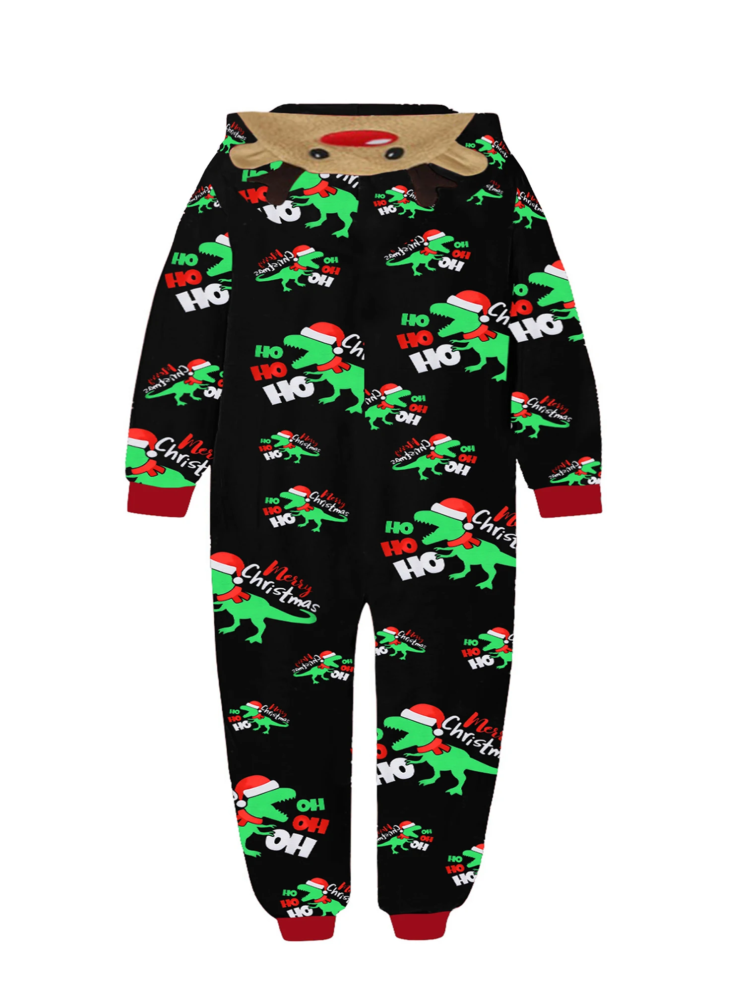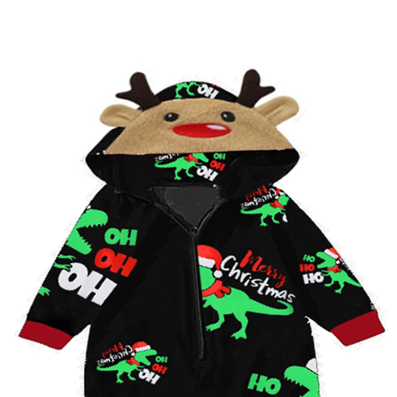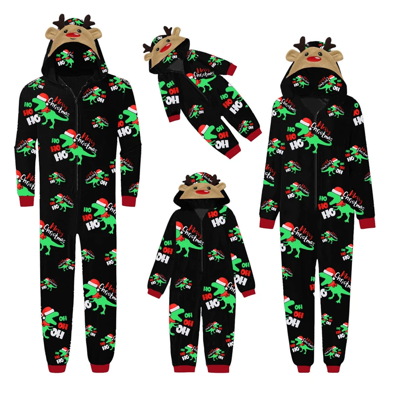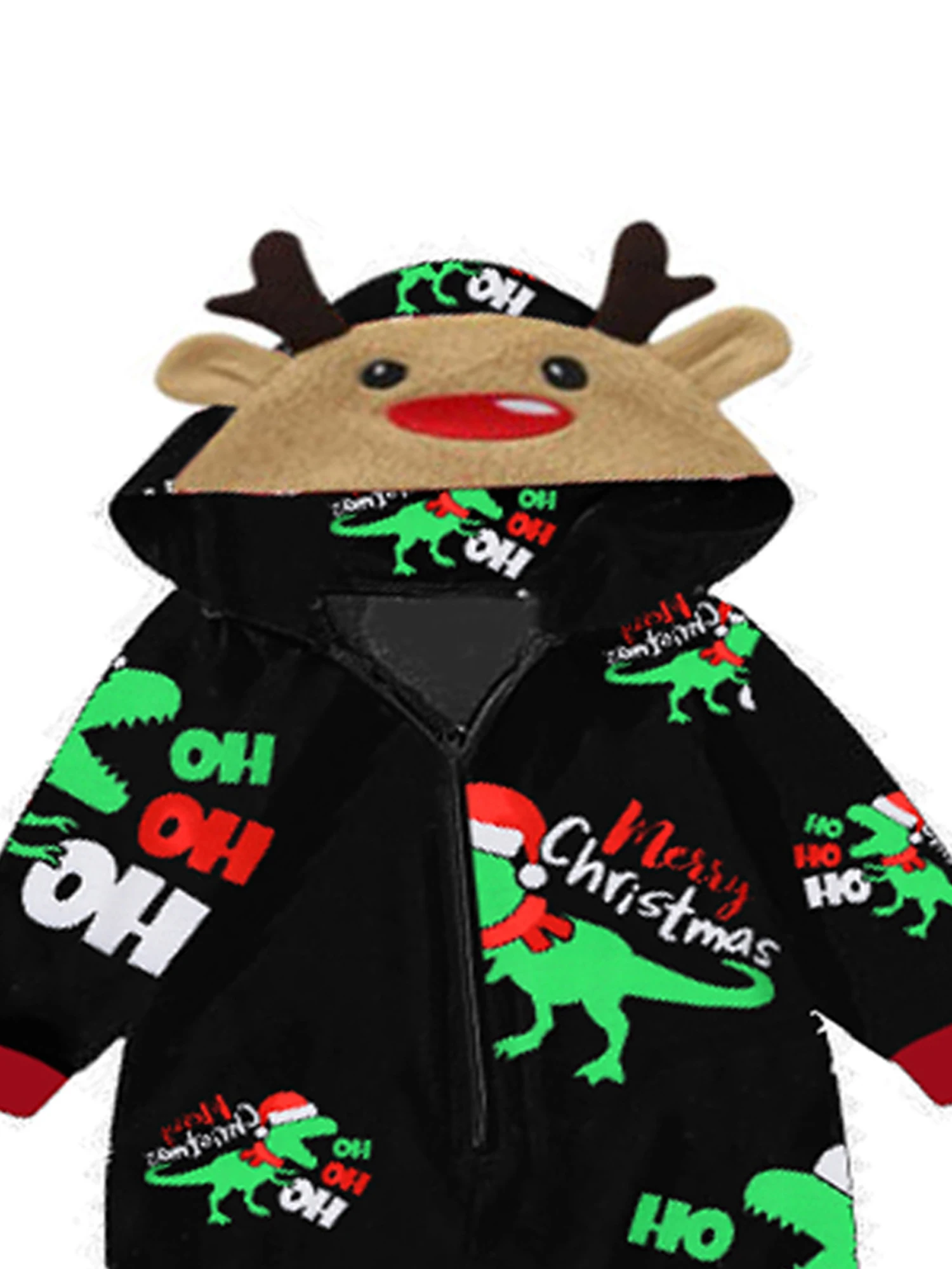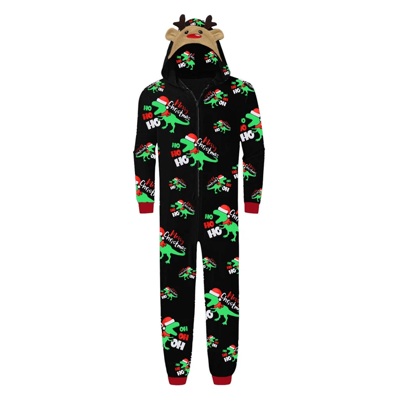 Christmas Family Matching Jumpsuit, Long Sleeve Hooded Dinosaur Print Zipper Closure Loungewear