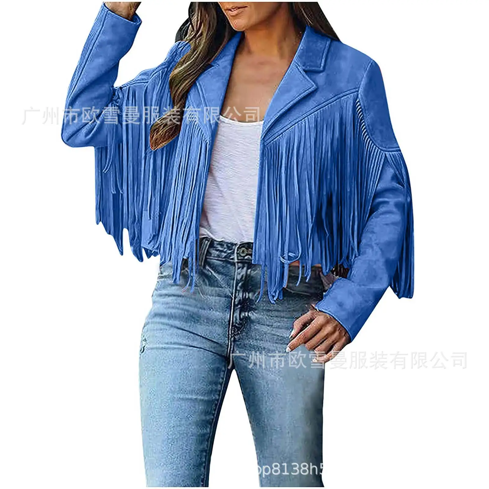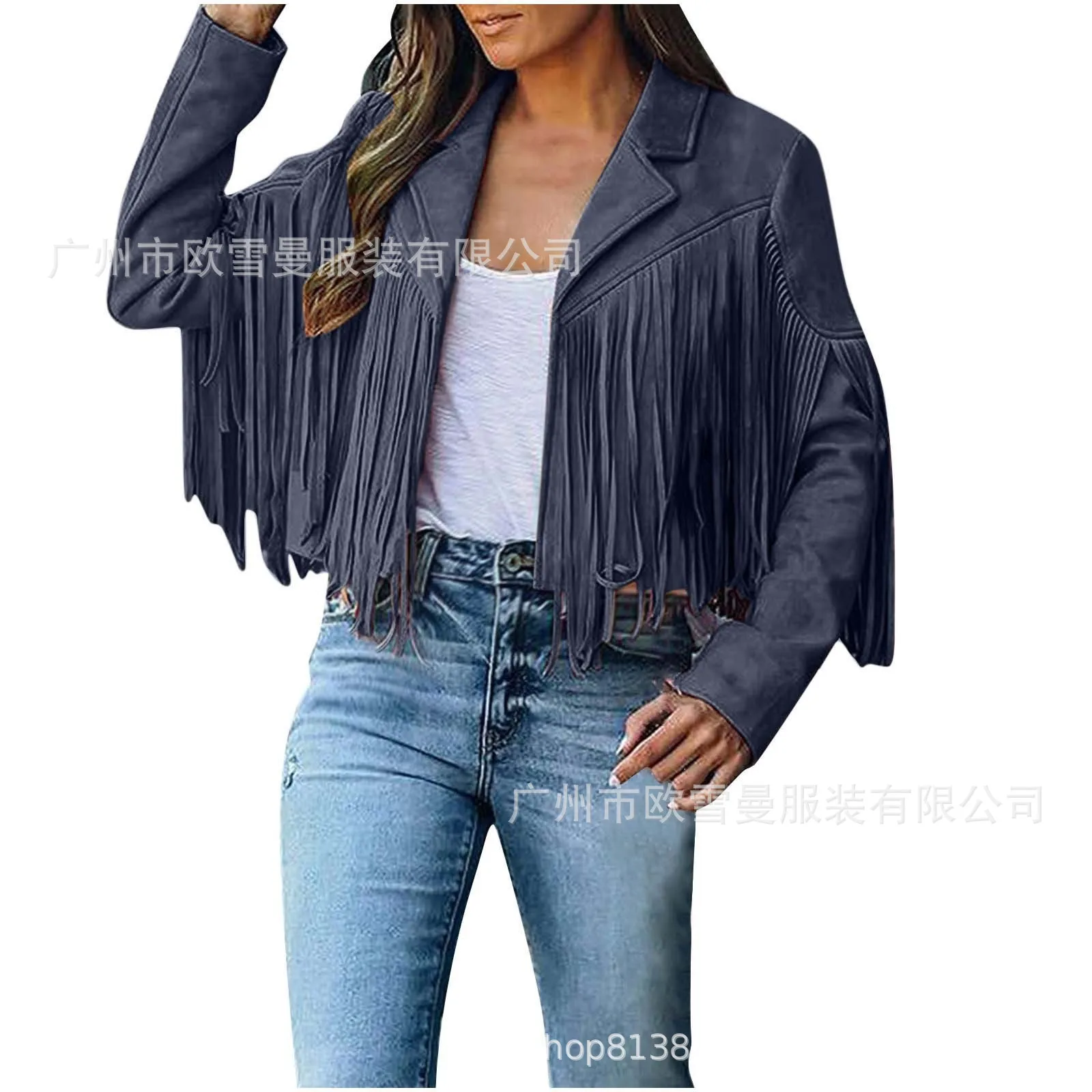 Europe and The United States Autumn New Fashion Solid Color Deerskin Velvet Patchwork Fringe Lapel Slim Cardigan Jacket Women