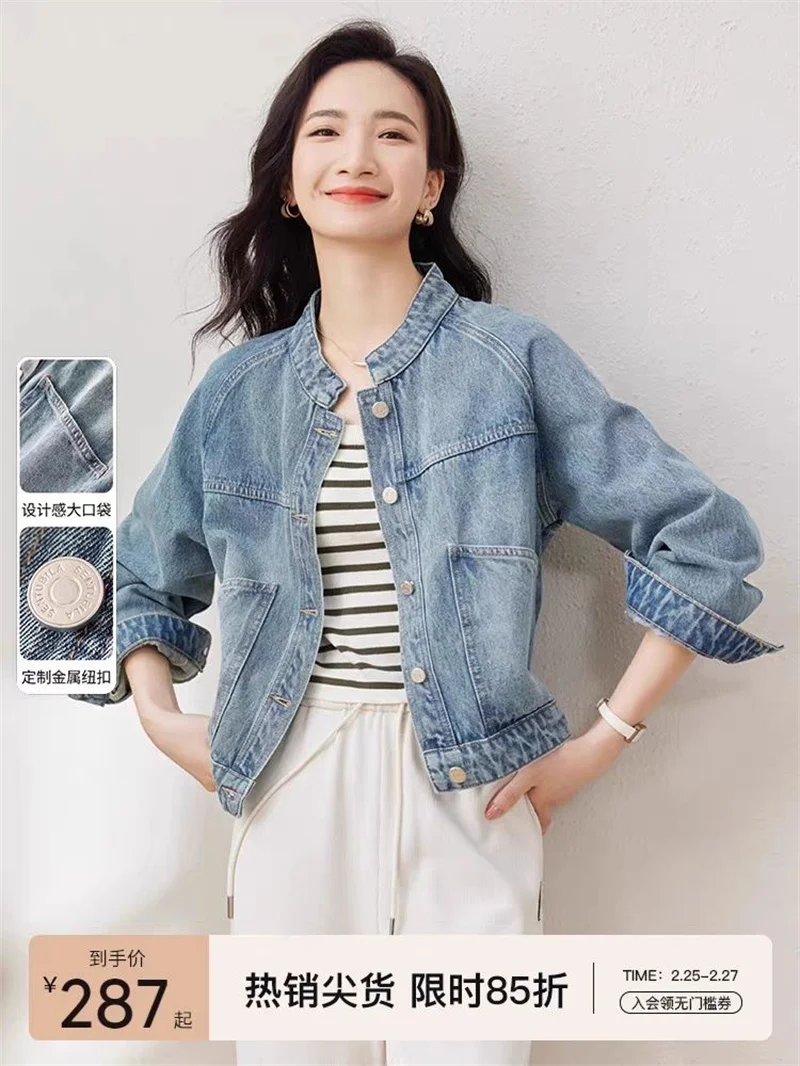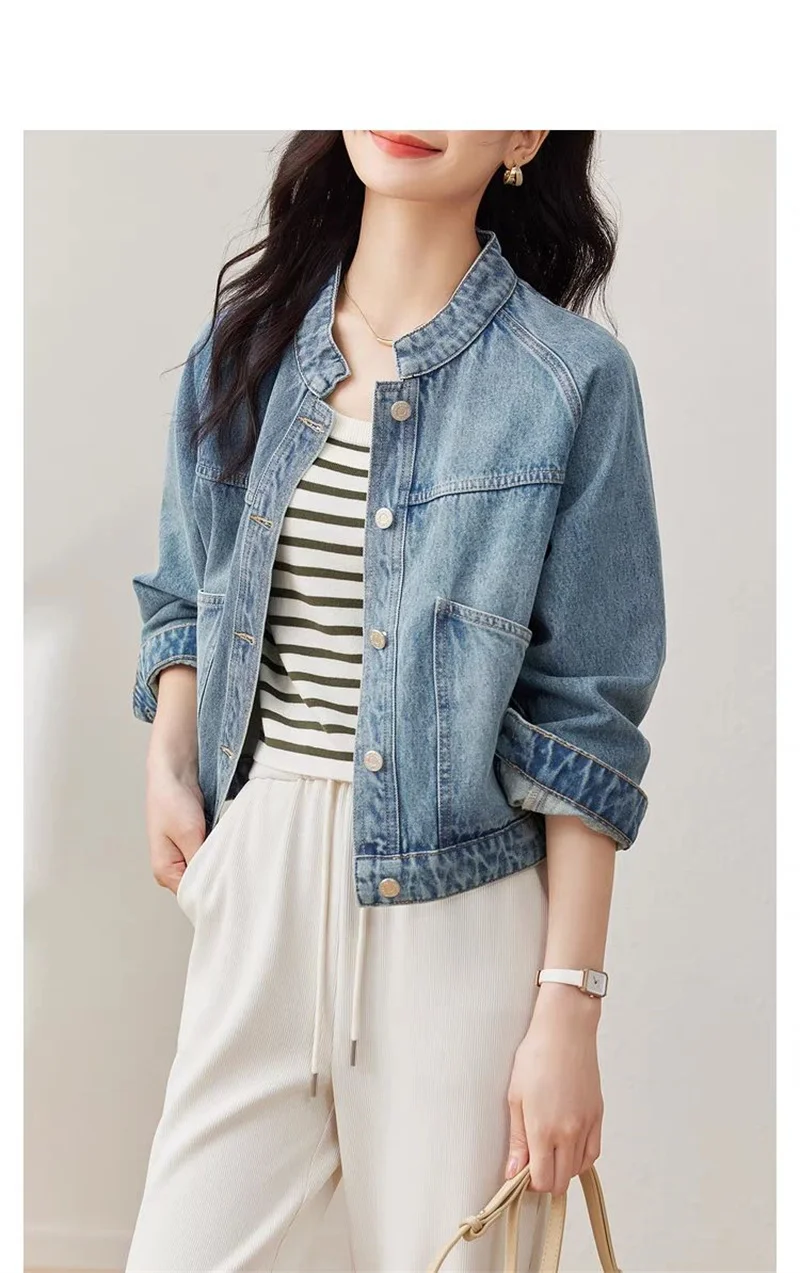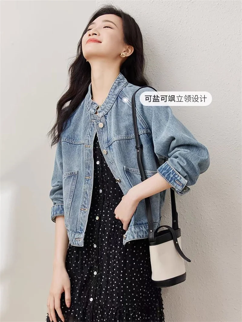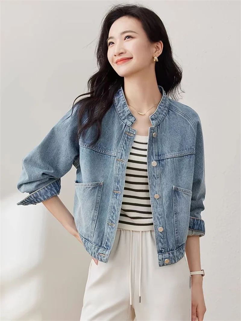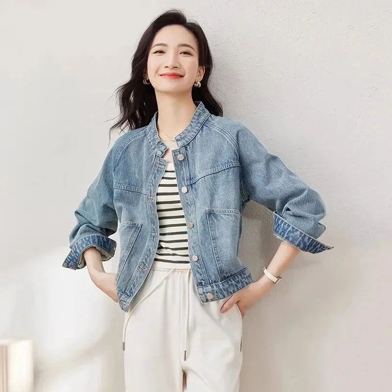 Retro Female Short Washing Cowboy Jacket Korean Women Stand-up Collar Long Sleeved Denim Coat 2024 Ladies Solid Color Jeans Tops