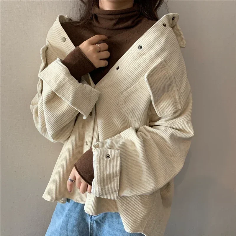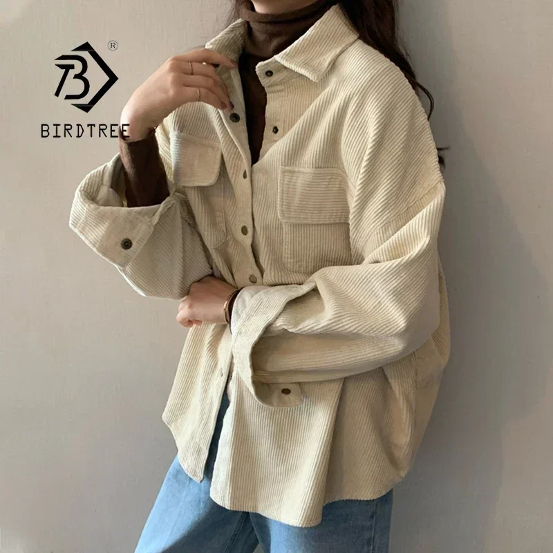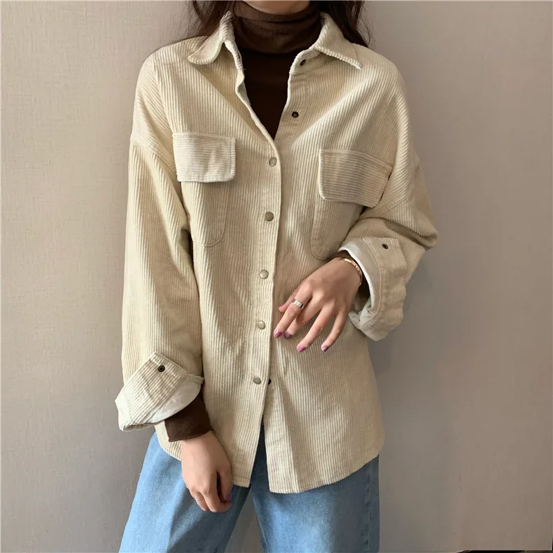 2021 Spring New Arrival Women Solid Corduroy Shirts Jackets Full Sleeve Turn-Down Collar Oversize Coats Casual Autumn Basic Outwear T0O901F