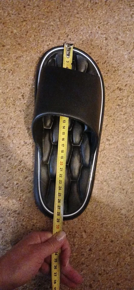 Beautiful slippers. Do not smell. massage effect for foot length 26.5 cm. ( 42 size) took size 44 – 45. Everything happened.