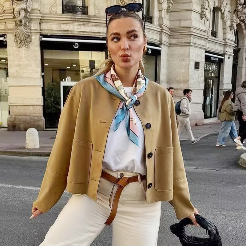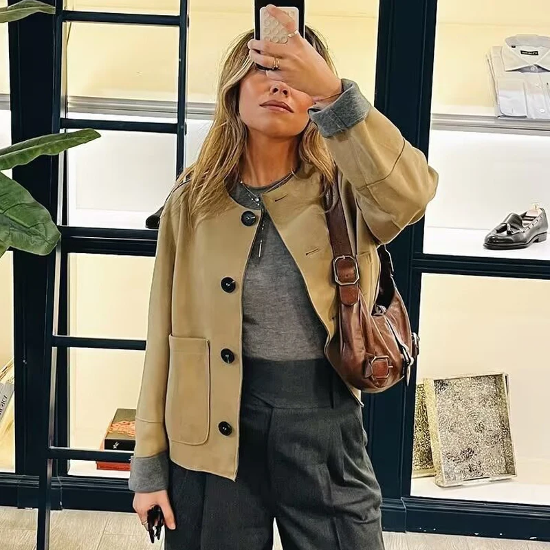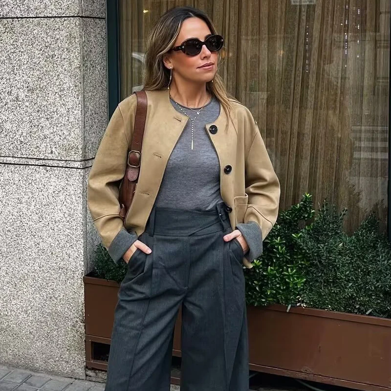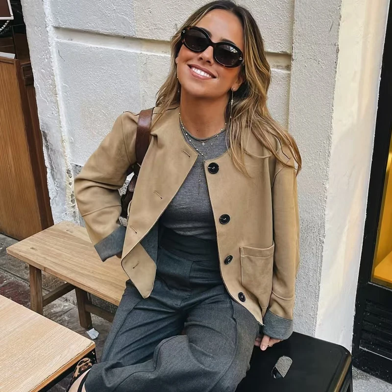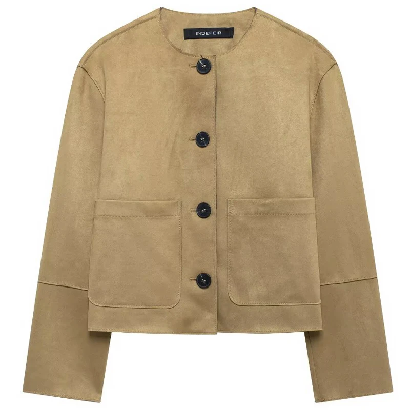 TRAF Suede Jacket Women Spring Outerwears 2025 New In Coats & Jackets Crop O-Neck Button Long Sleeve Coats Chic Elegant Jackets