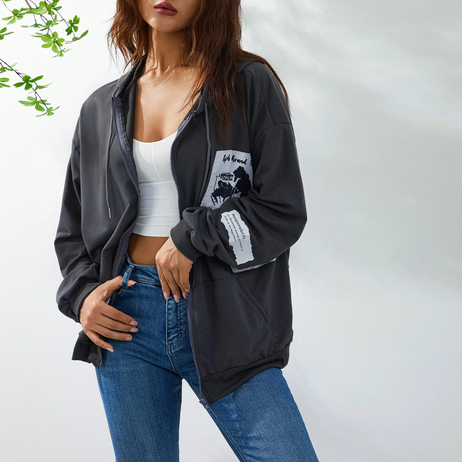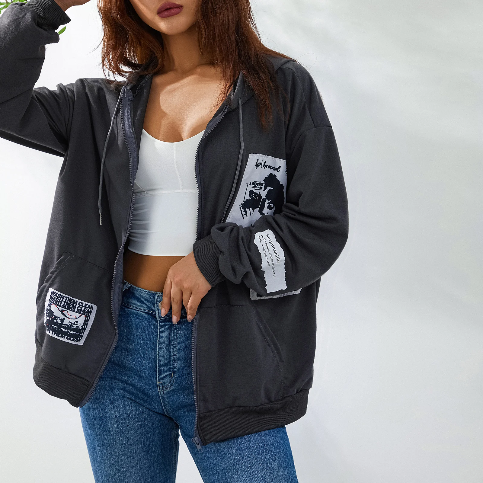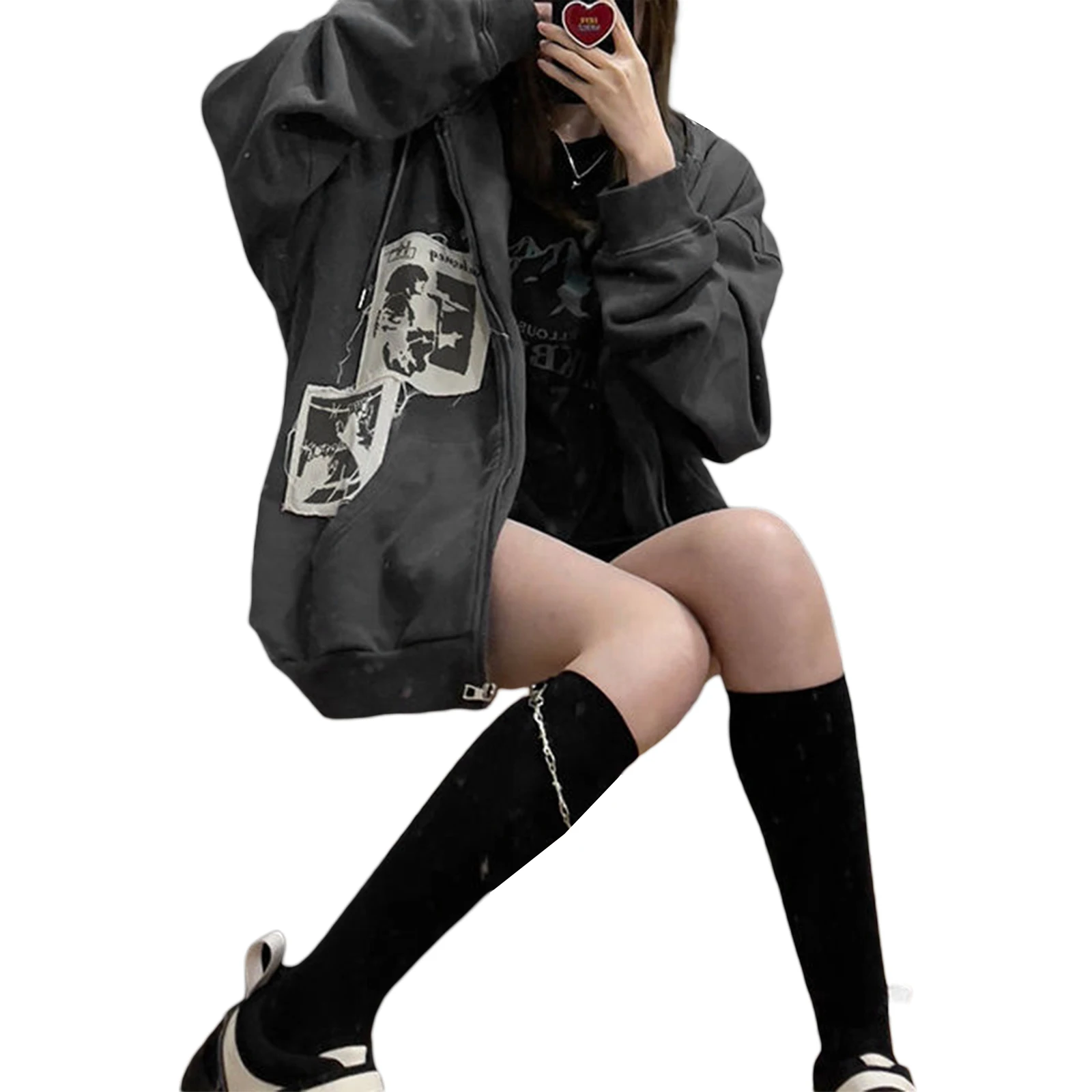Vintage Graffiti Print Oversized Coats for Wmen Grunge Kawaii E-Girl Aesthetic Long Sleeve Zip Up Hooded Outerwear Streetwear