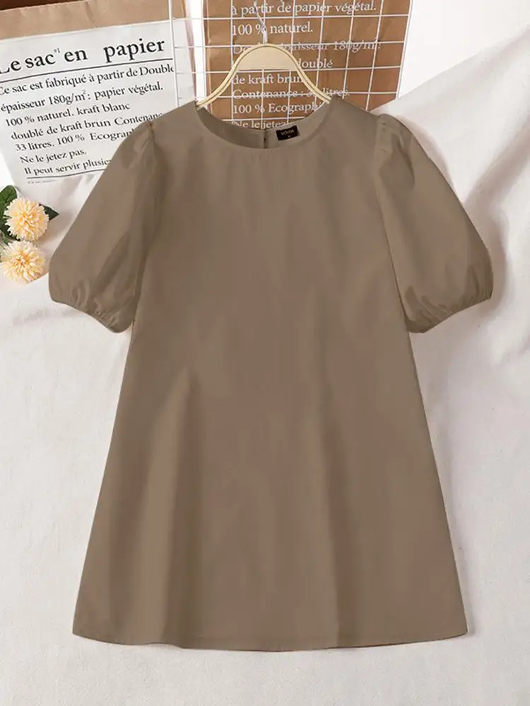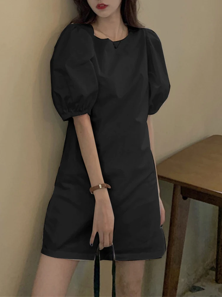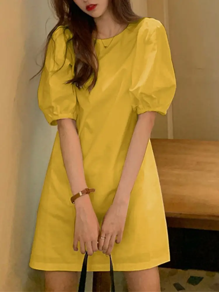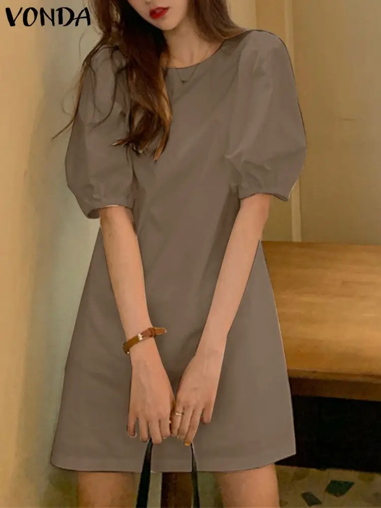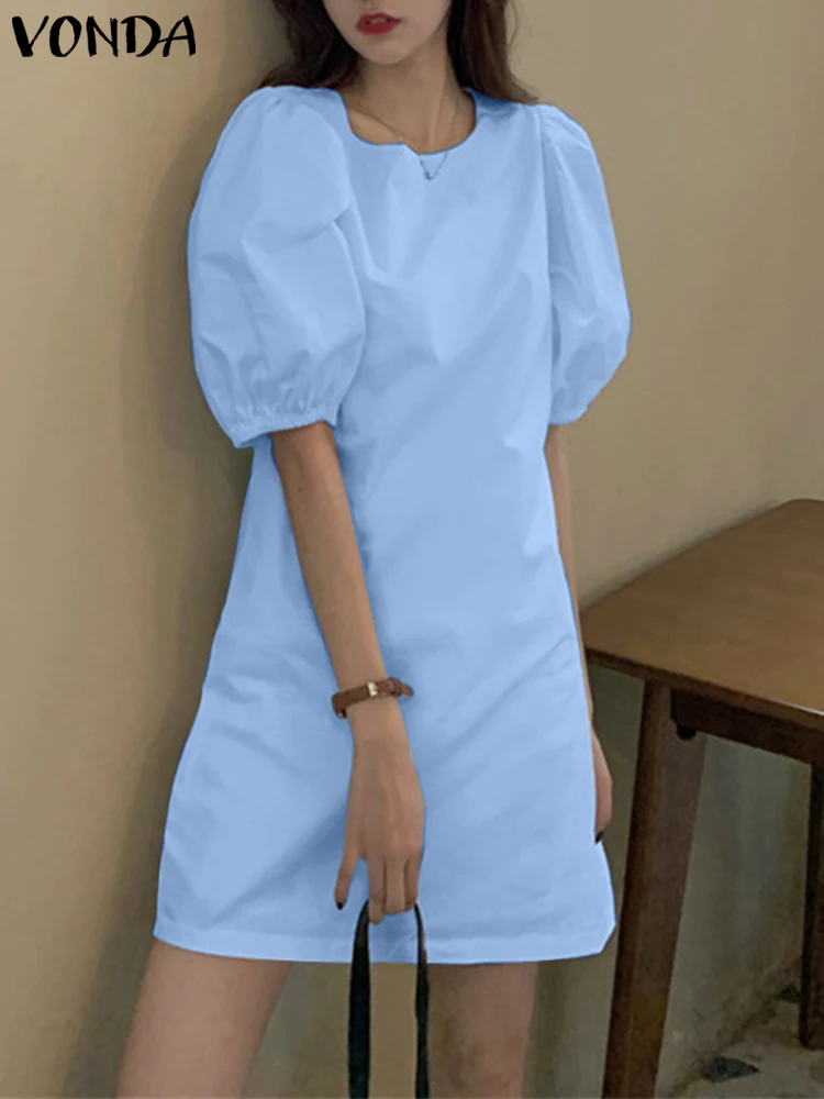 VONDA Summer Party Mini Dress 2024 Women Elegant Short Puff Sleeve Casual Solid Sundress O Neck Loose Pleated Holiday Vestidos