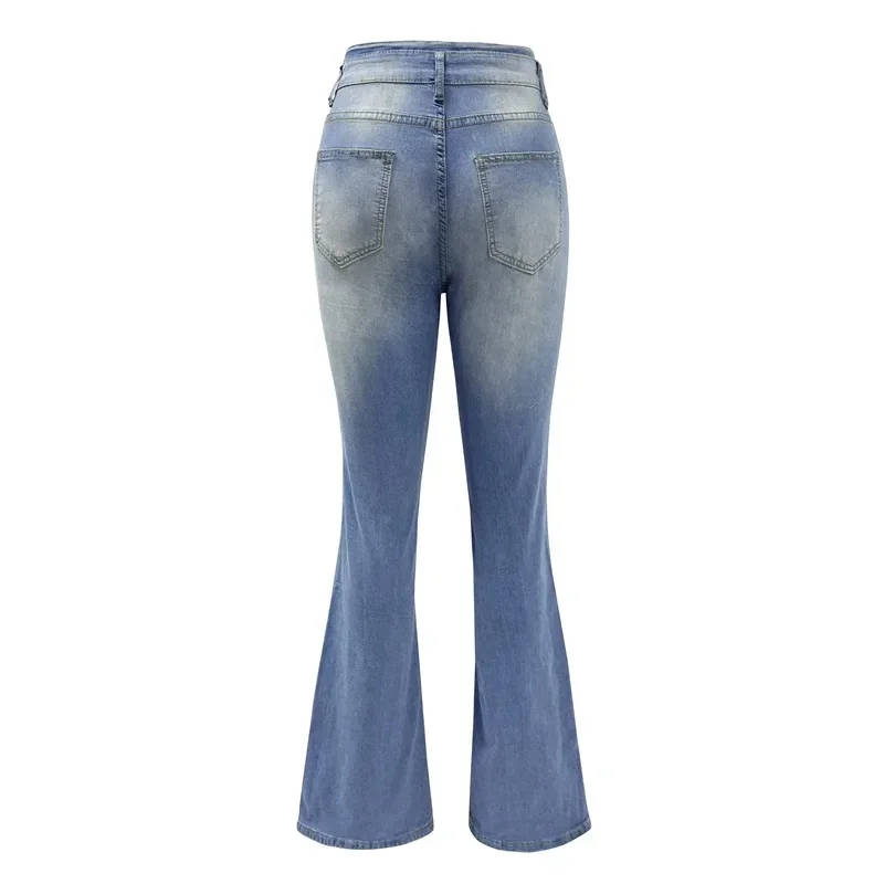 Women Denim Jeans Spliced High Waist Solid Color Flare Pants Single Breasted Button Pockets Zipper Fly Streetwear Spring